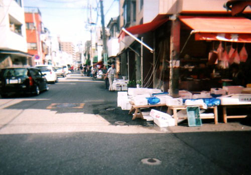 生麦事件碑で大通りからちょっと入って、静かな道になります。魚河岸通りなんて名前ついてるけど、昔の話だろうなあと思ってたらほんとに魚売ってました。地元ではみない種類のものがいろいろ居て面白いです。にょろっとしっぽの生えたような変な貝とか、あれどうやって食べるんだろう?